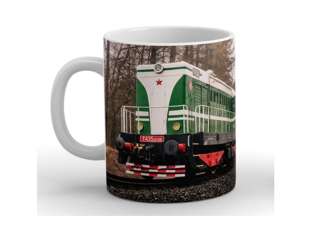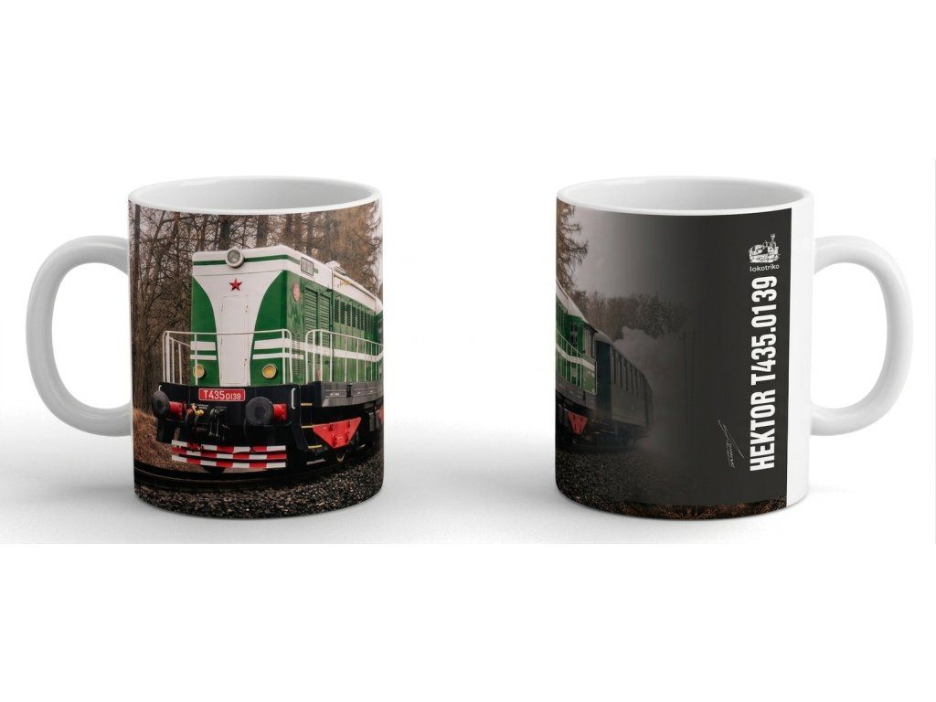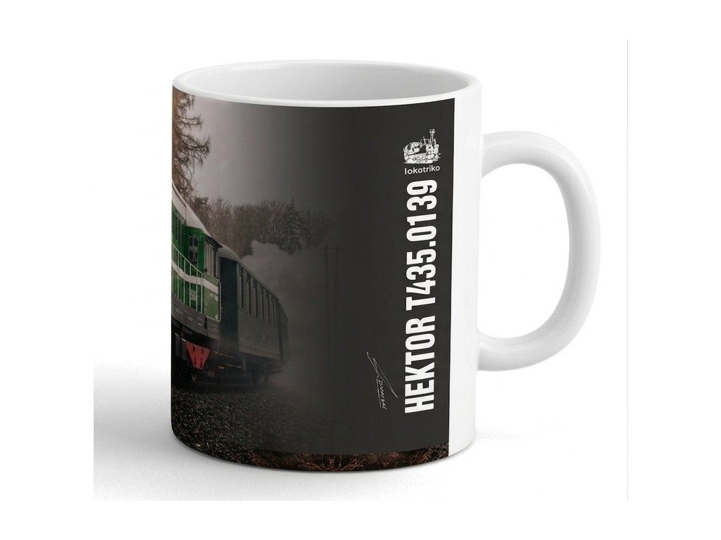 Vychutnejte si kávu či čaj s legendární parní kráskou Hektor T435.0139. Bílý porcelánový hrnek s celoplošným sublimačním potiskem po vnějším obvodu potěší každého milovníka železnice i poctivého designu – doma, v kanceláři i na cestách.
