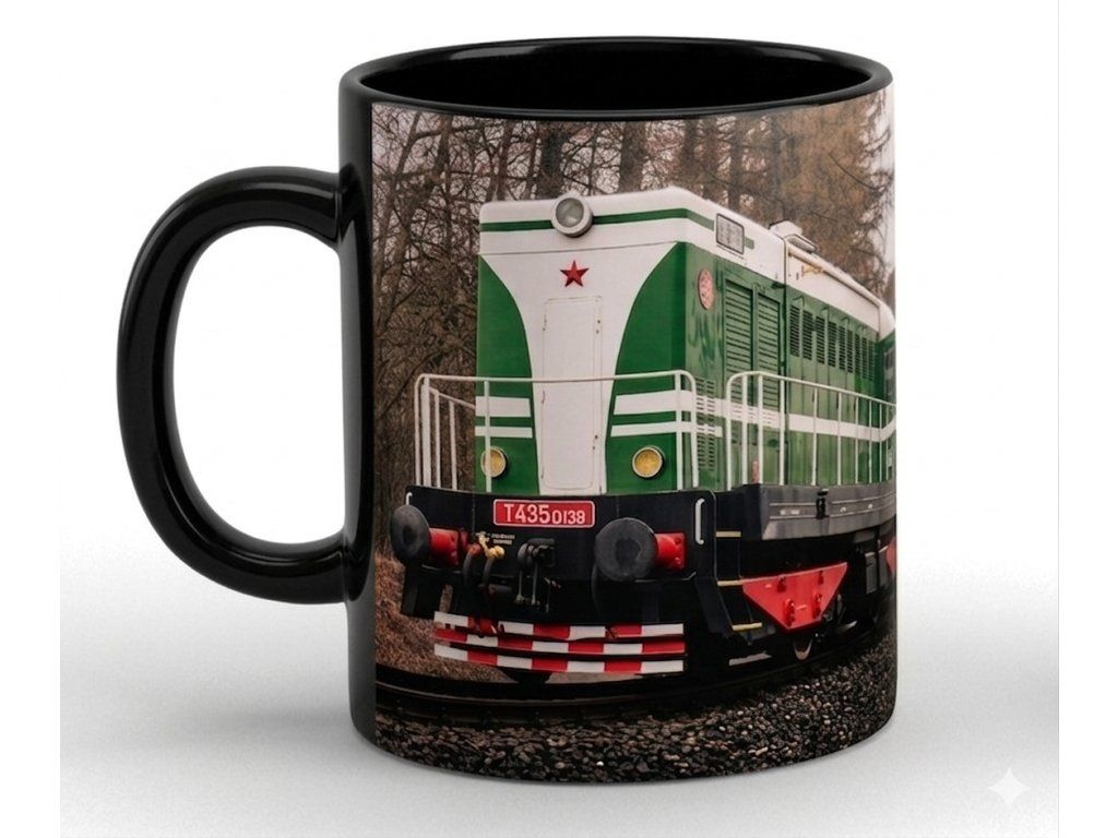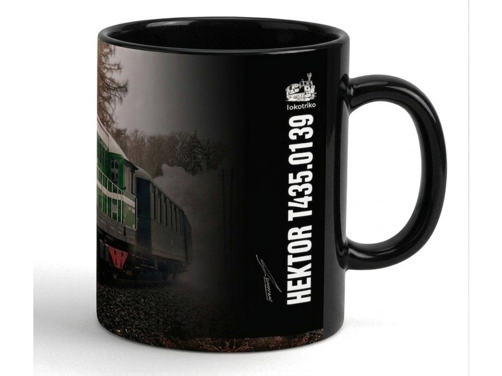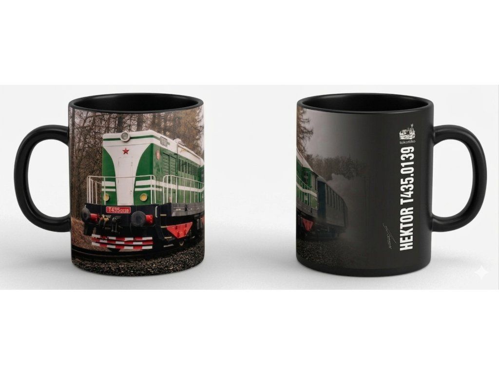 Vychutnejte si kávu či čaj s legendární parní lokomotivou Hektor T435.0139. Černý porcelánový hrnek s celoplošným sublimačním potiskem po vnějším obvodu potěší každého milovníka železnice i poctivého designu – doma, v kanceláři i na cestách.