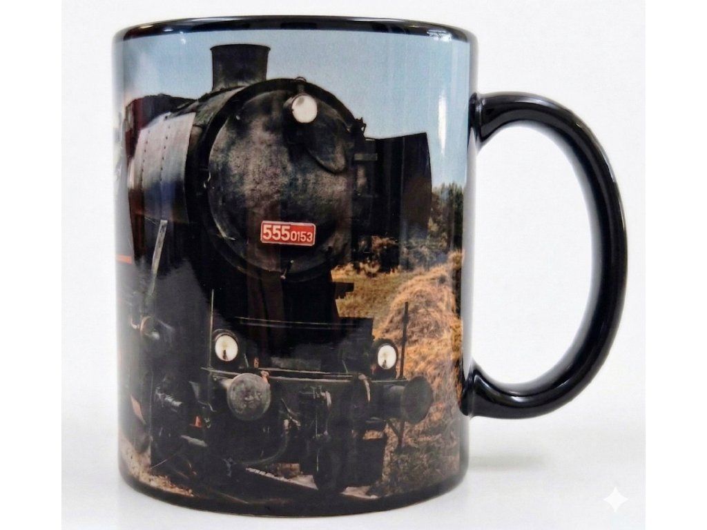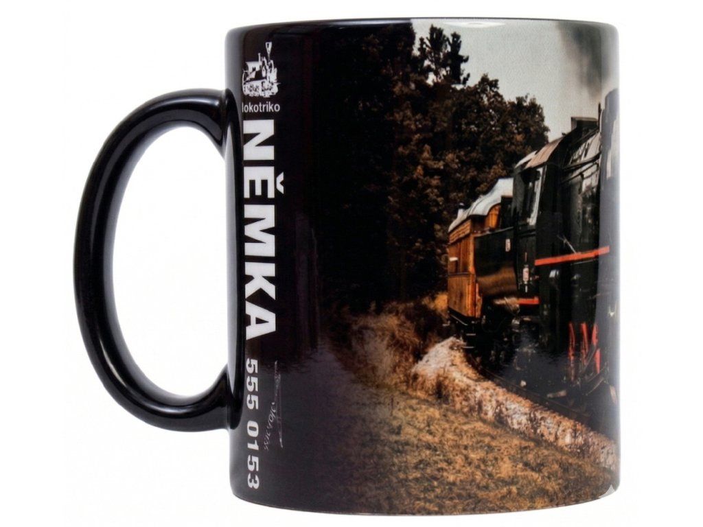 Vychutnejte si kávu, čaj i kakao s ikonickým motivem parní lokomotivy „Němka“. Kvalitní černý porcelán a celoplošný sublimační potisk po obvodu zvýrazní každý detail a promění každé posezení v návrat na koleje.